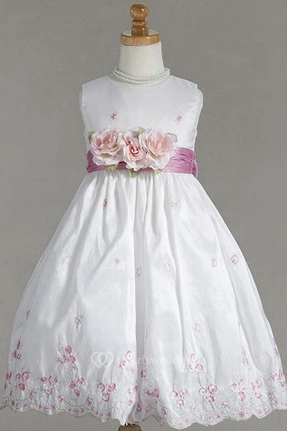 Tea-Length Bowed Embroideried Taffeta Flower Girl Dress