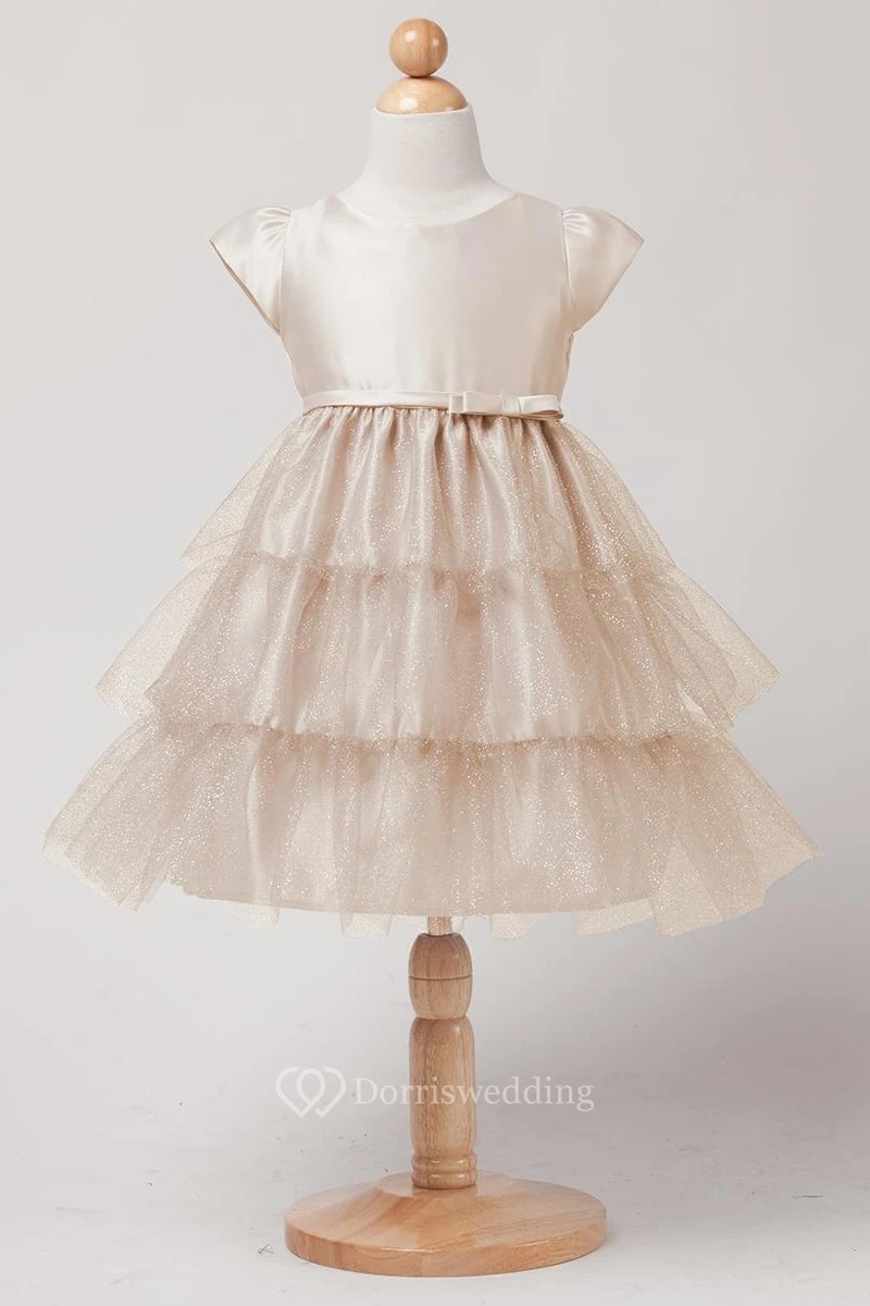 Tea-Length Bowed Empire Cap-Sleeve Satin Flower Girl Dress With Ruffles
