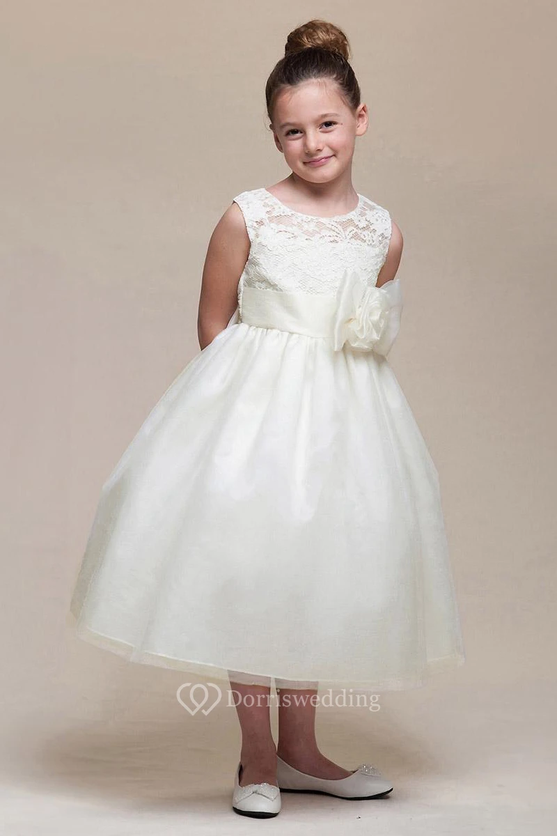 Tea-Length Bowed Empire Floral Tulle&Lace Flower Girl Dress With Ribbon