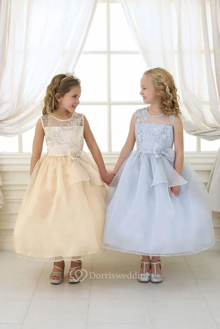 Tea-Length Bowed Floral Lace&Organza Flower Girl Dress With Illusion