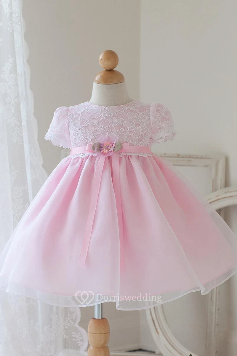 Tea-Length Bowed Floral Lace&Organza Flower Girl Dress With Ribbon