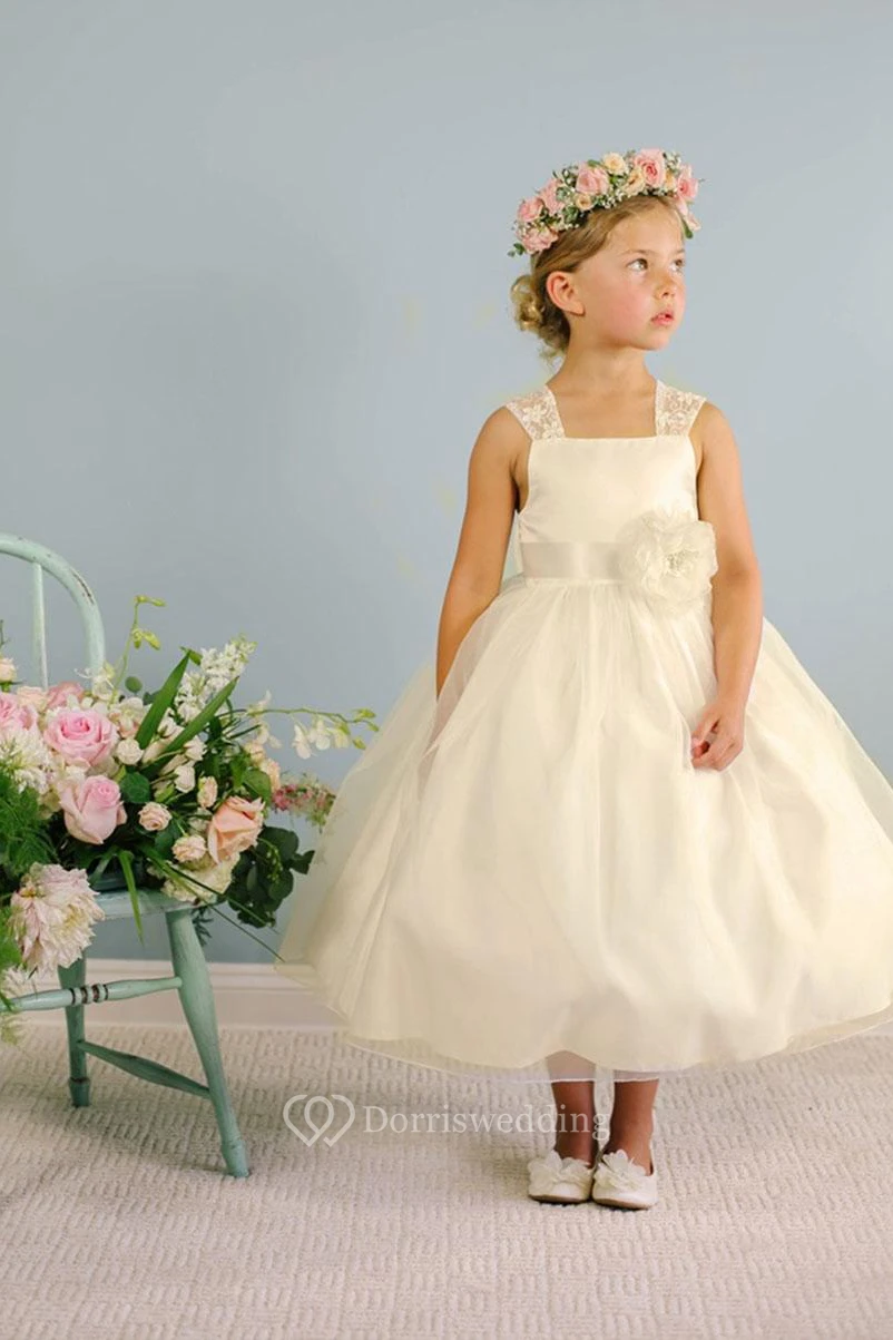 Tea-Length Bowed Floral Lace&Organza Flower Girl Dress With Sash
