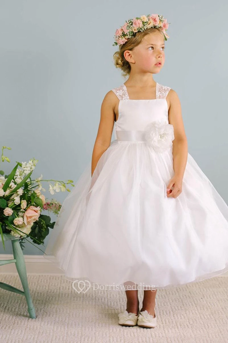 Tea-Length Bowed Floral Lace&Organza Flower Girl Dress With Sash
