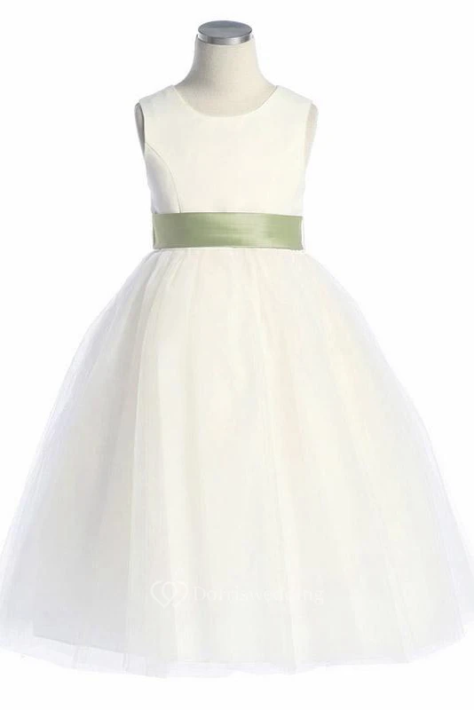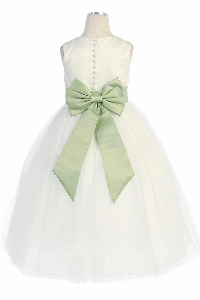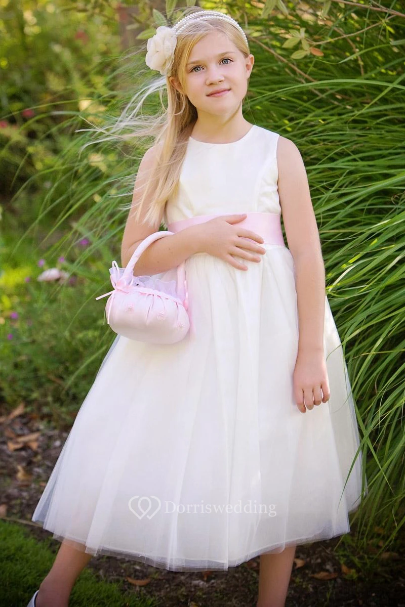 Tea-Length Bowed Sleeveless Tulle&Satin Flower Girl Dress