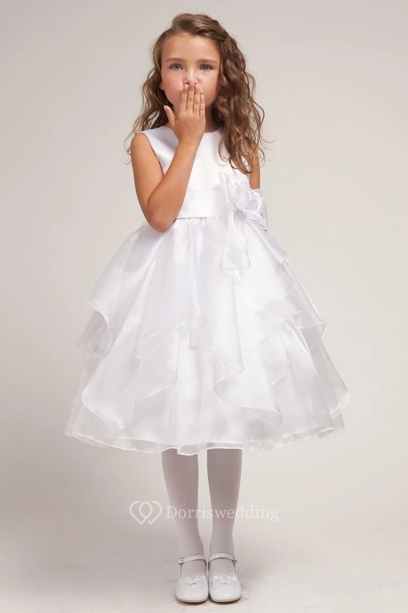 Tea-Length Bowed Split-Front Organza&Satin Flower Girl Dress