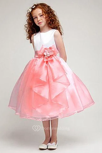 Tea-Length Bowed Split-Front Organza&Satin Flower Girl Dress