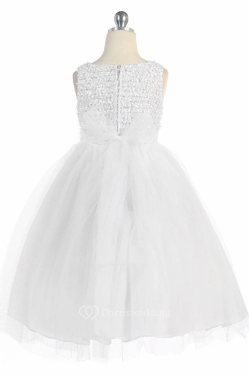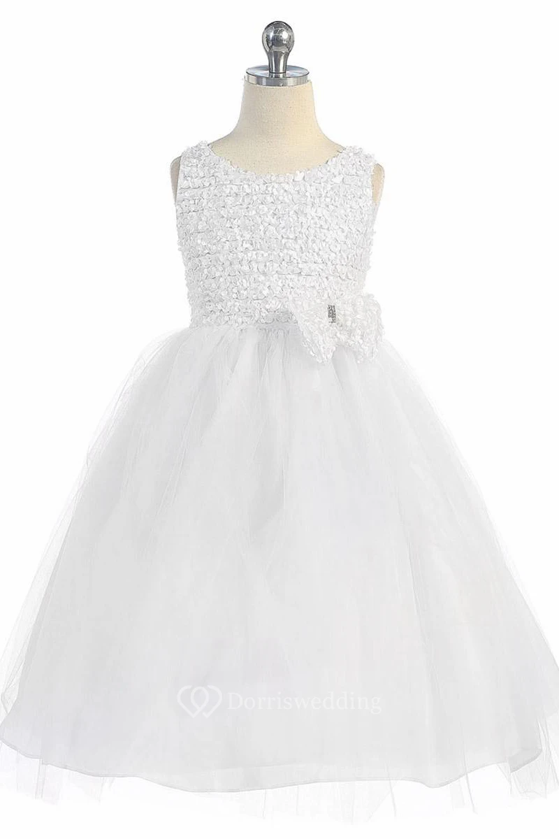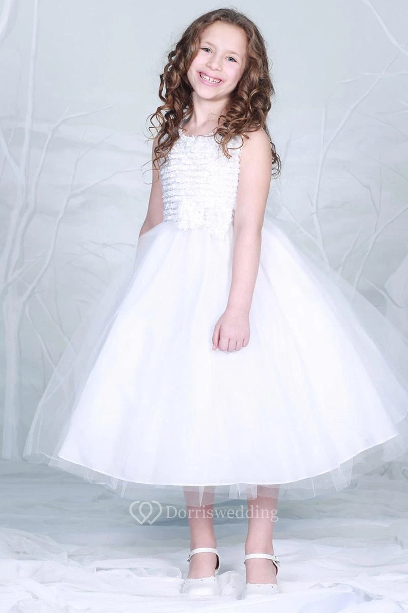 Tea-Length Bowed Tiered Tulle Flower Girl Dress