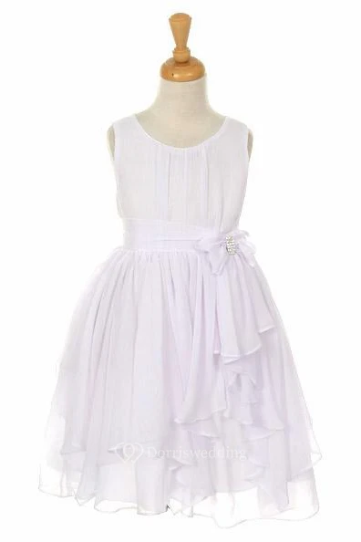 Tea-Length Broach Bowed Chiffon Flower Girl Dress