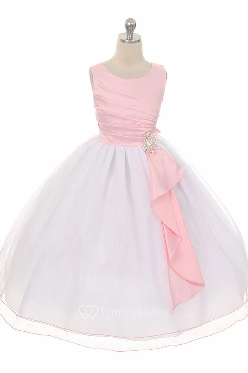 Tea-Length Broach Pleated Satin Flower Girl Dress With Ruffles