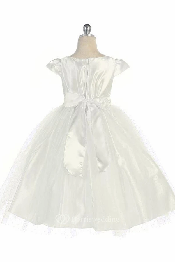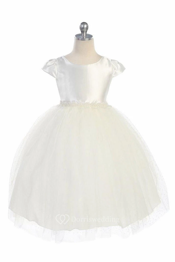 Tea-Length Cap-Sleeve Beaded Tulle&Satin Flower Girl Dress