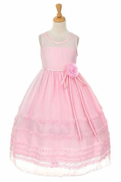 Tea-Length Embroideried Tiered Floral Flower Girl Dress With Ribbon