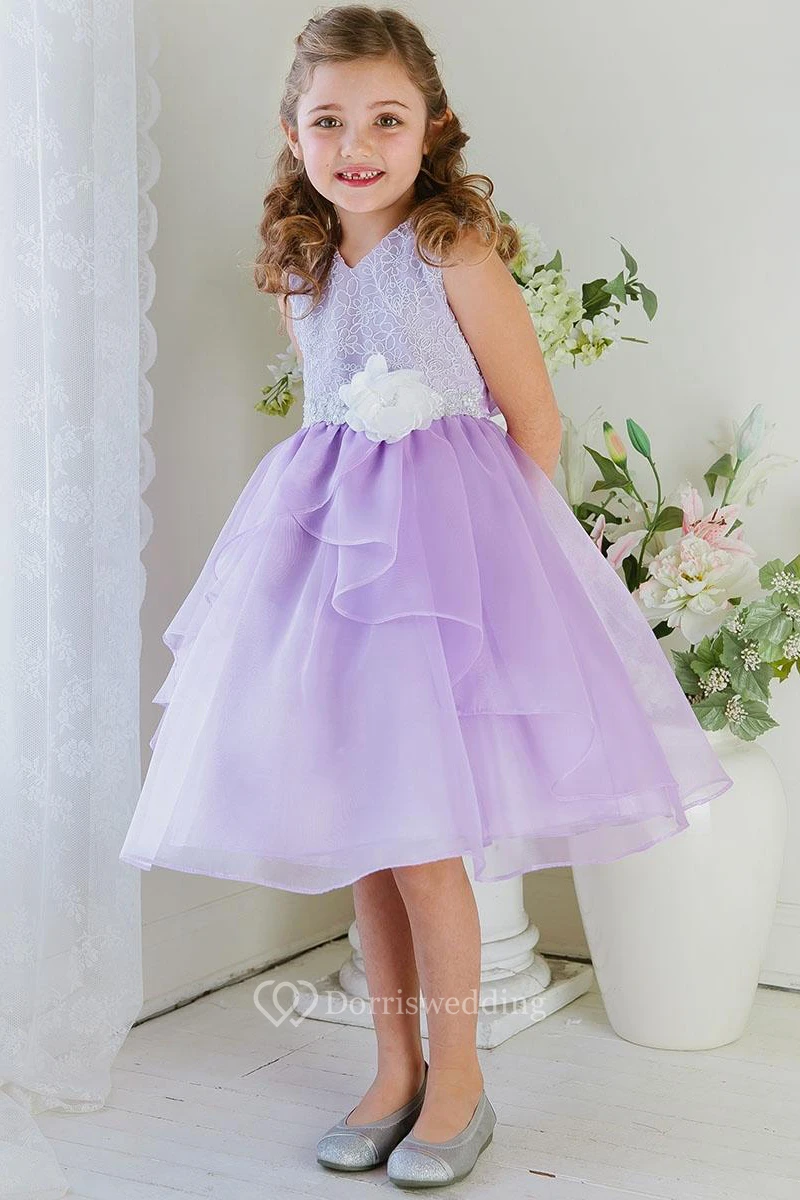 Tea-Length Embroideried Tiered Lace&Organza Flower Girl Dress