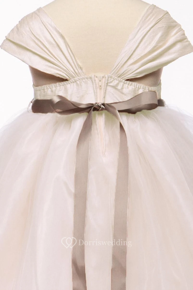 Tea-Length Empire Cap-Sleeve Ruched Tulle&Satin Flower Girl Dress
