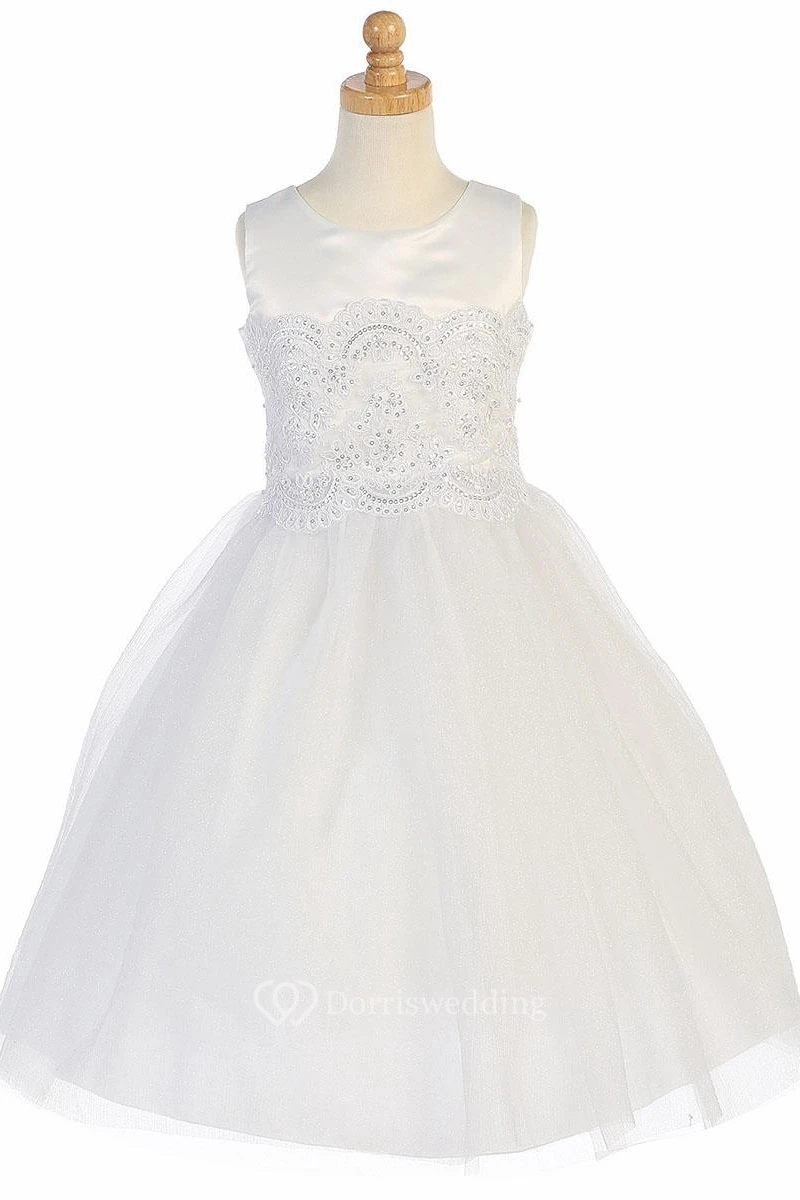 Tea-Length Floral Beaded Appliqued Tulle&Lace Flower Girl Dress With Tiers