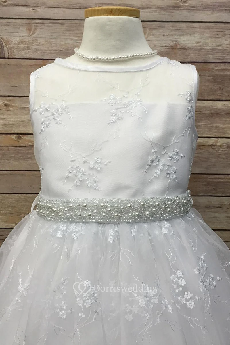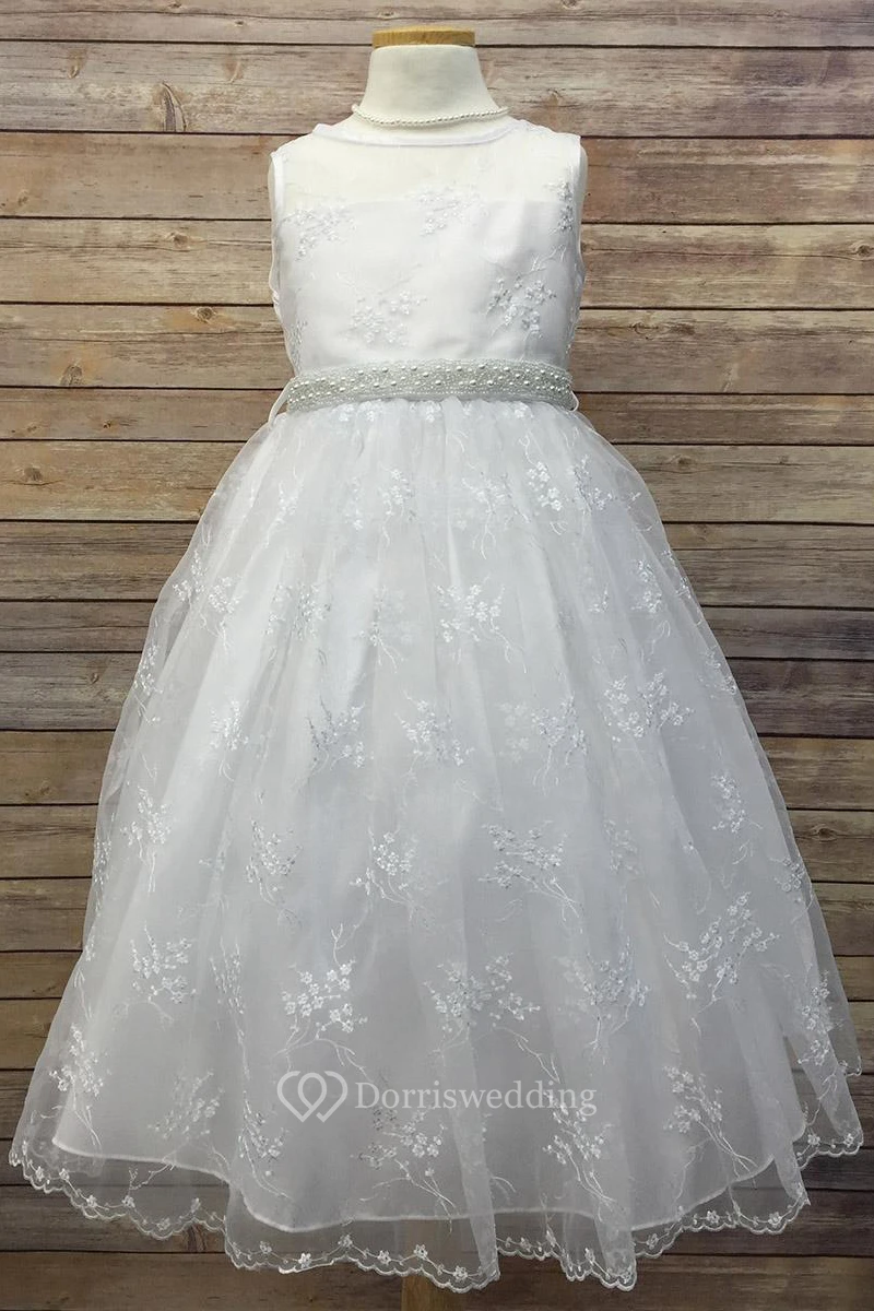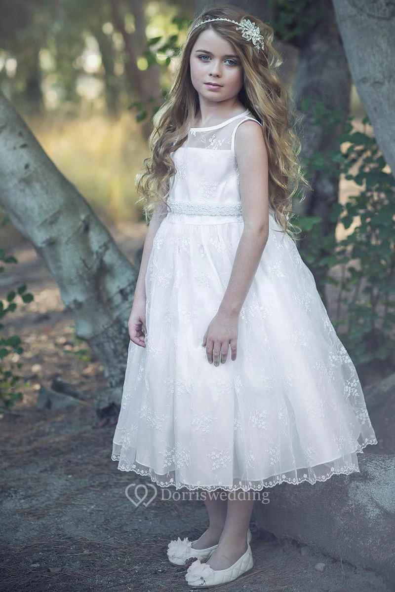 Tea-Length Floral Beaded Lace&Organza Flower Girl Dress With Illusion