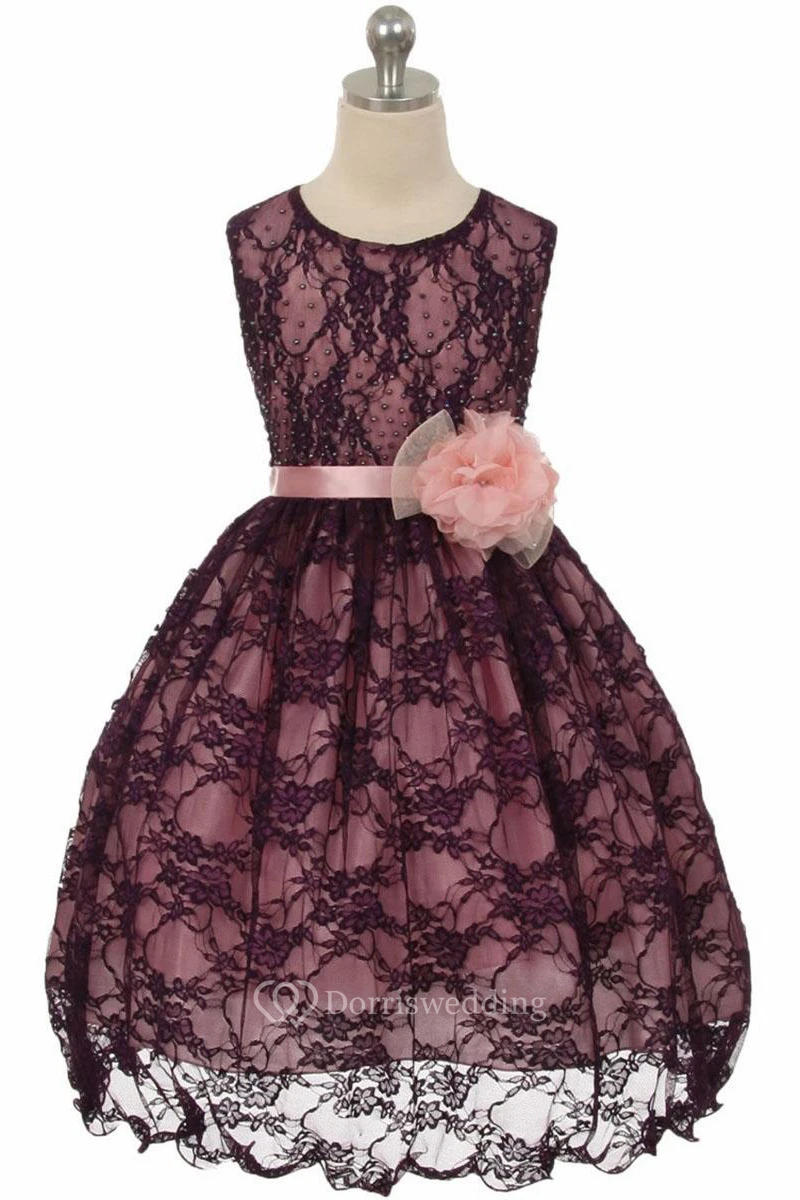 Tea-Length Floral Beaded Lace&Satin Flower Girl Dress With Sash