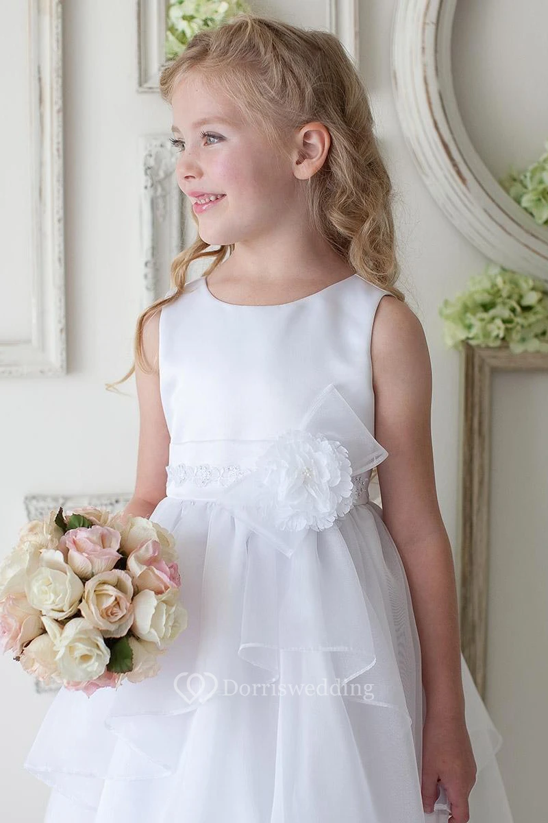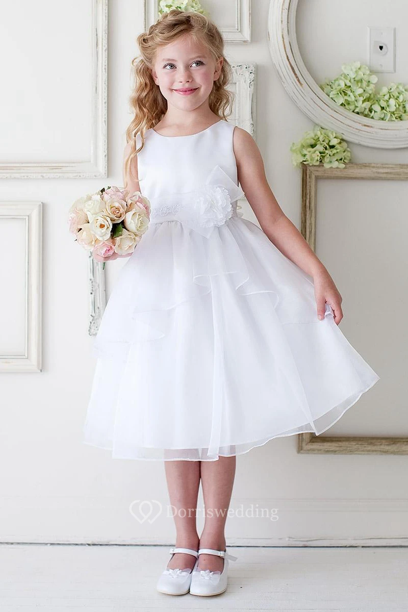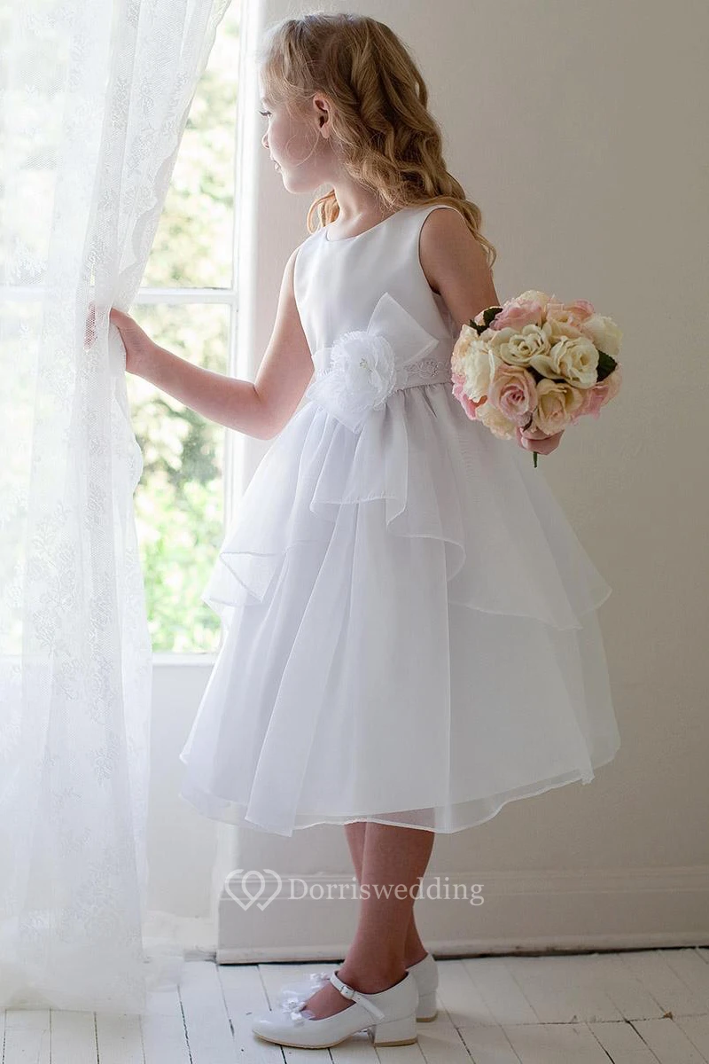 Tea-Length Floral Bowed Appliqued Lace&Organza Flower Girl Dress With Tiers