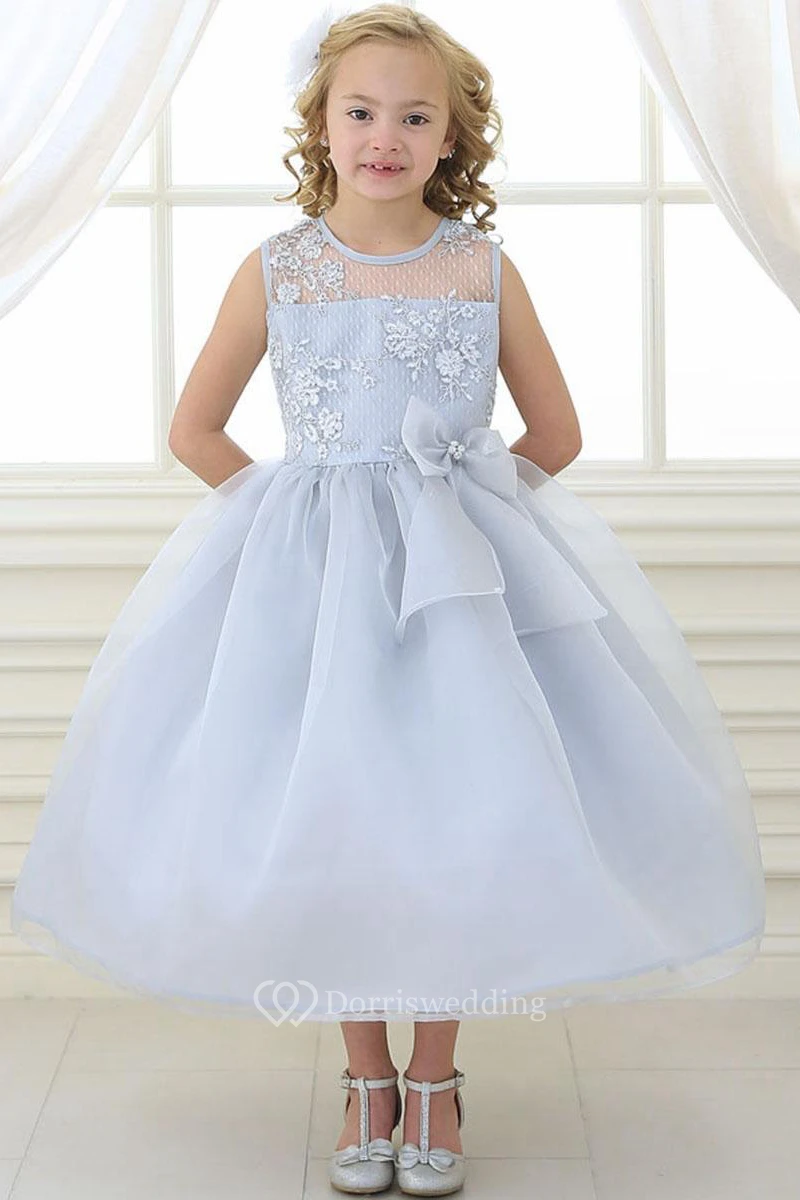 Tea-Length Floral Bowed Lace&Organza Flower Girl Dress With Illusion