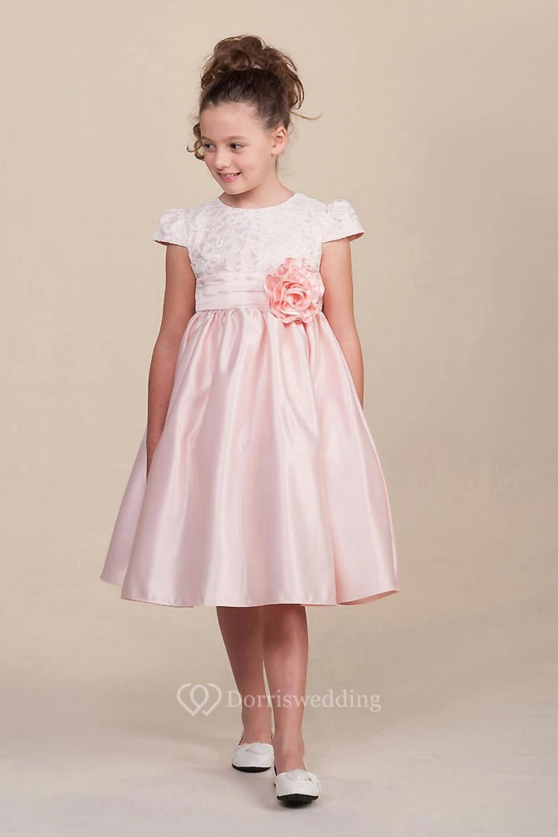 Tea-Length Floral Cap-Sleeve Tiered Lace&Satin Flower Girl Dress