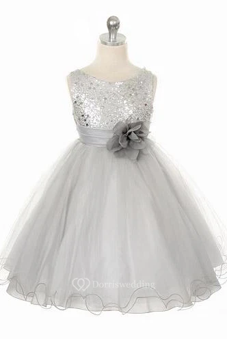 Tea-Length Floral Floral Sequins&Satin Flower Girl Dress With Ribbon
