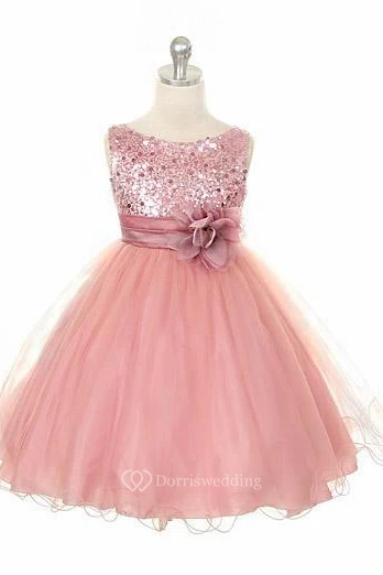Tea-Length Floral Floral Sequins&Satin Flower Girl Dress With Sash