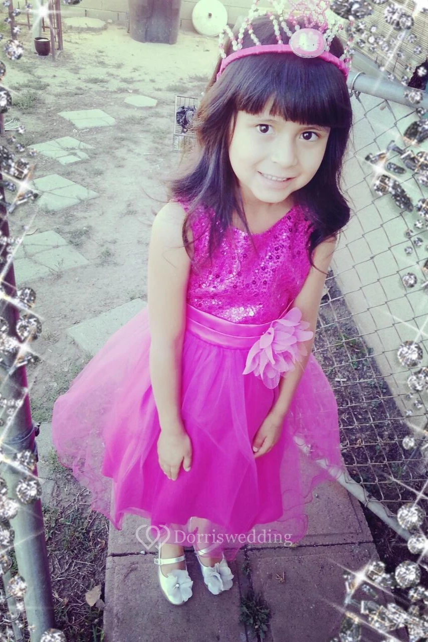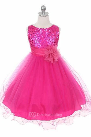 Tea-Length Floral Floral Sequins&Satin Flower Girl Dress With Sash