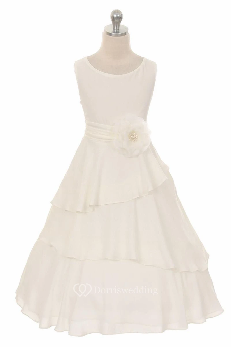 Tea-Length Floral Ruched Floral Chiffon Flower Girl Dress With Sash