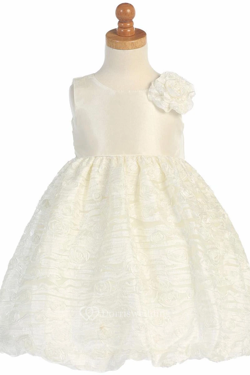 Tea-Length Floral Tiered Empire Tulle&Taffeta Flower Girl Dress With Embroidery