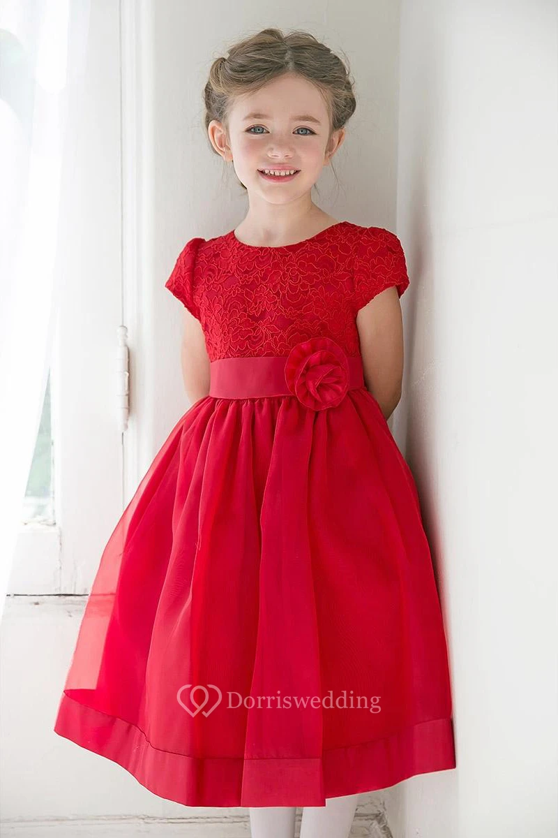 Tea-Length Floral Tiered Lace&Organza Flower Girl Dress With Ribbon