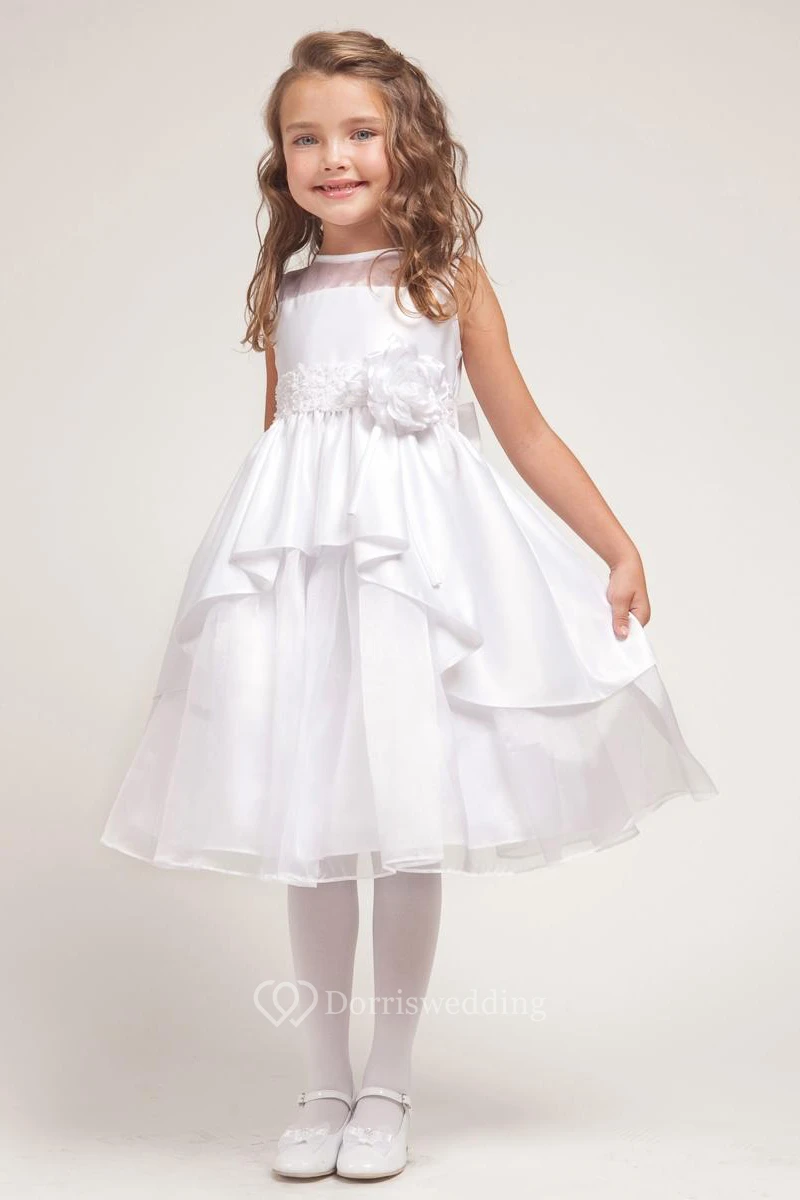 Tea-Length Floral Tiered Lace&Organza Flower Girl Dress With Sash