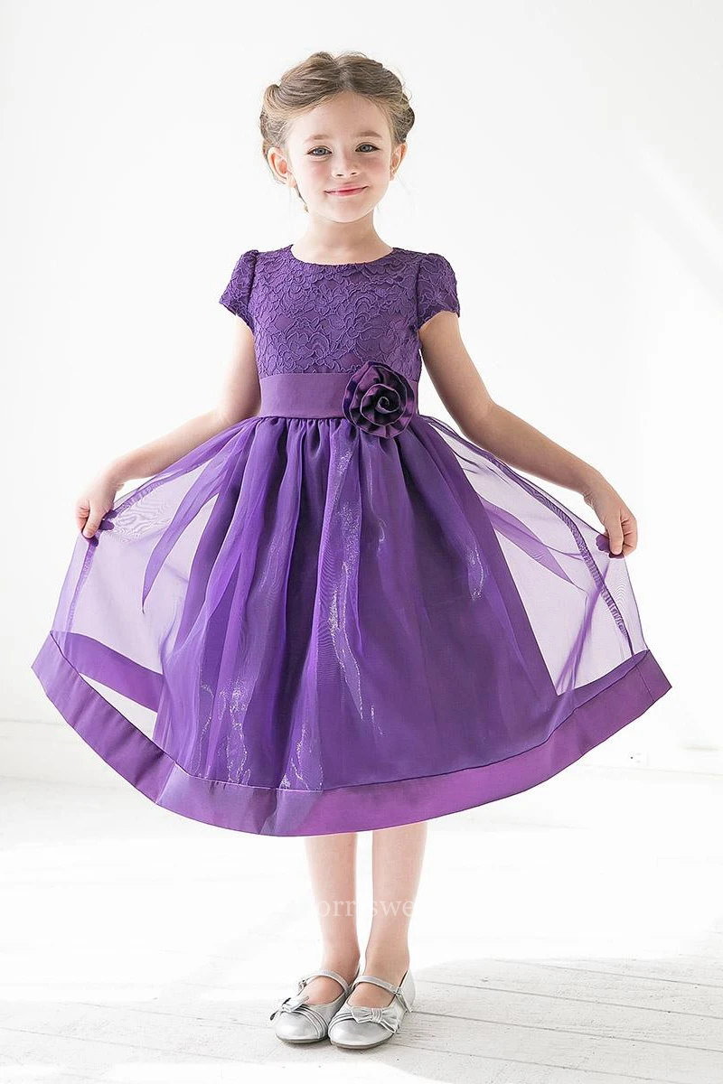 Tea-Length Floral Tiered Lace&Organza Flower Girl Dress With Sash