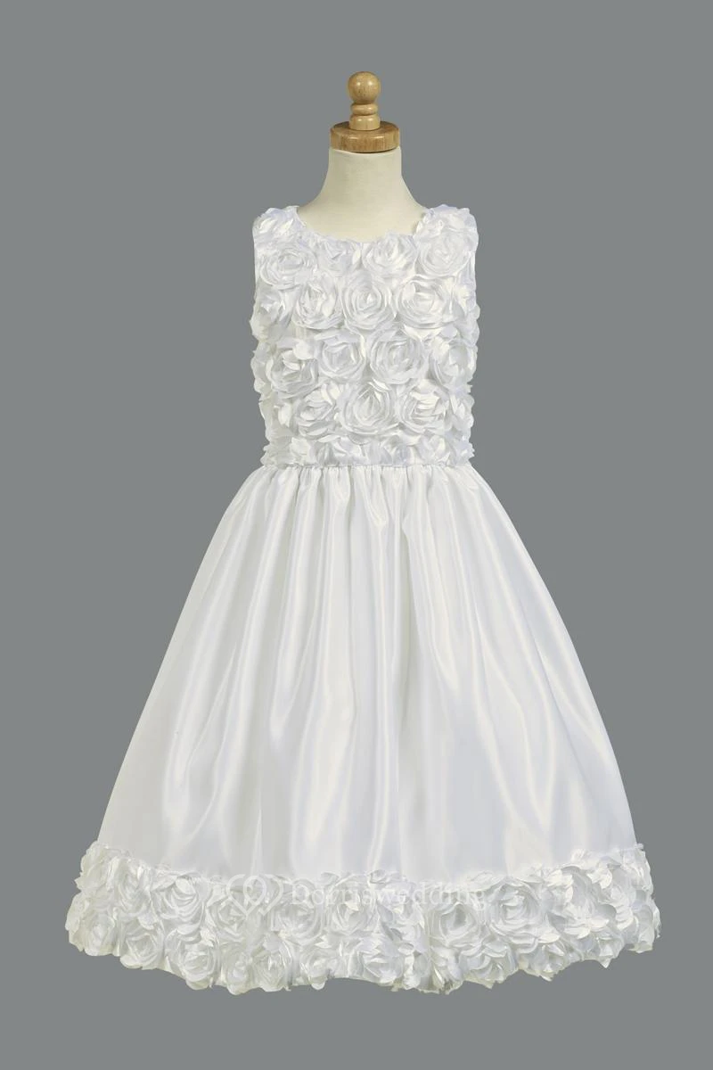 Tea-Length Floral Tiered Satin Flower Girl Dress With Embroidery
