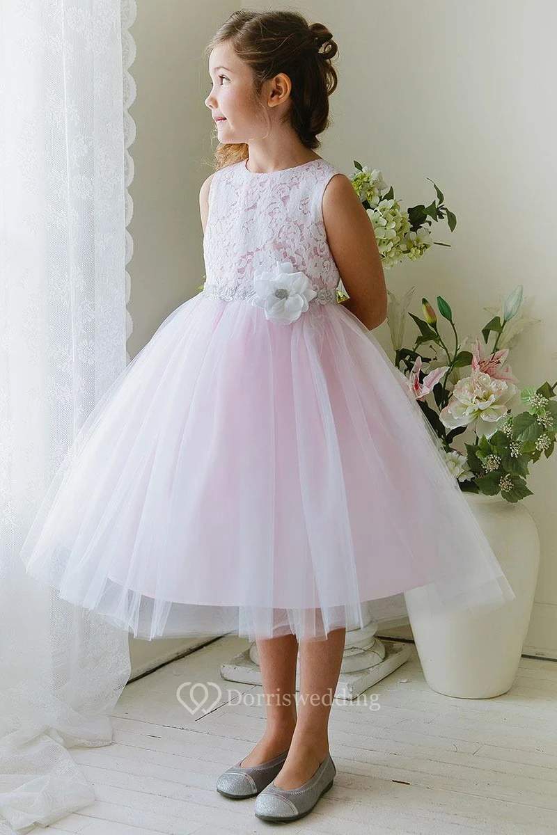 Tea-Length Floral Tiered Tulle&Lace Flower Girl Dress
