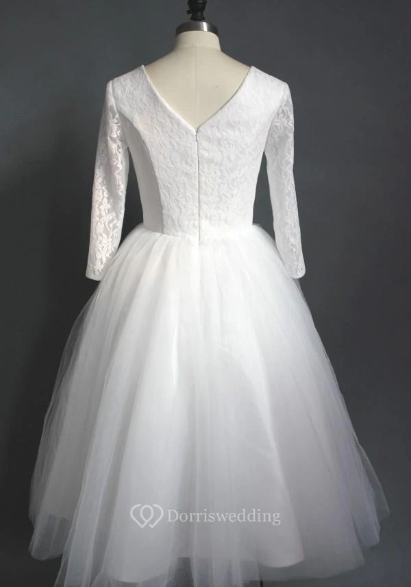 Tea Length High Quality A-line V Neck Lace Top Puffy Tulle Short Wedding Dress with Sleeves