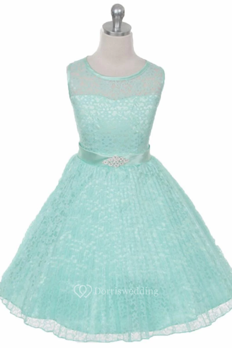 Tea-Length Illusion Pleated Lace&Satin Flower Girl Dress