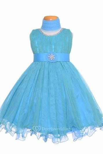 Tea-Length Jewel Pleated Tiered Tulle&Satin Flower Girl Dress