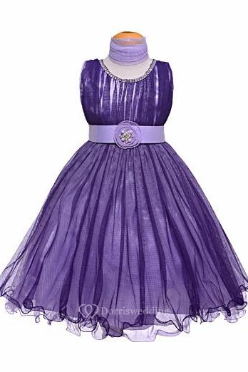 Tea-Length Jewel Tiered Pleated Tulle&Satin Flower Girl Dress