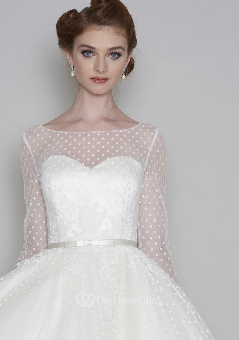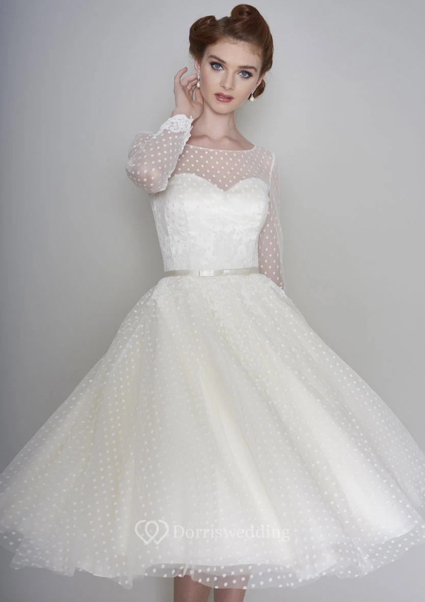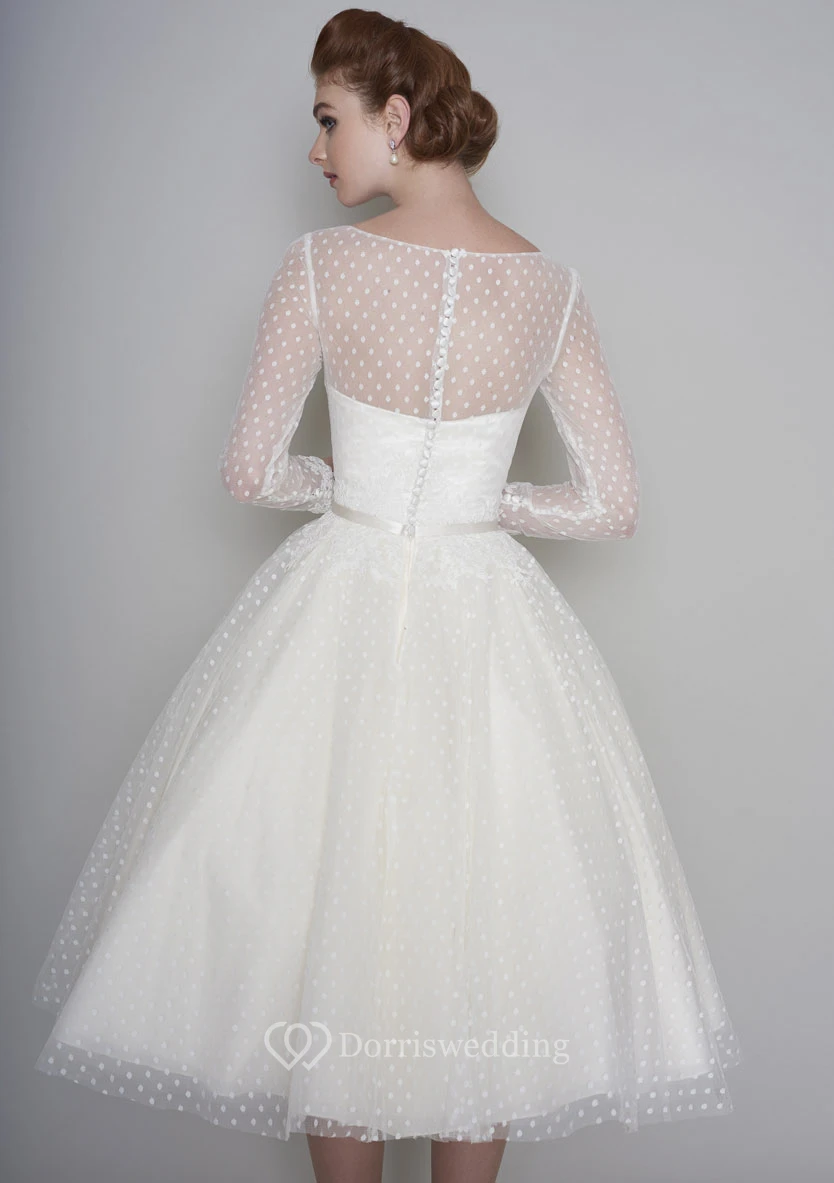 Tea Length Long Sleeve Vintage Illusion Bateau And Sweetheart Tulle Wedding Dress