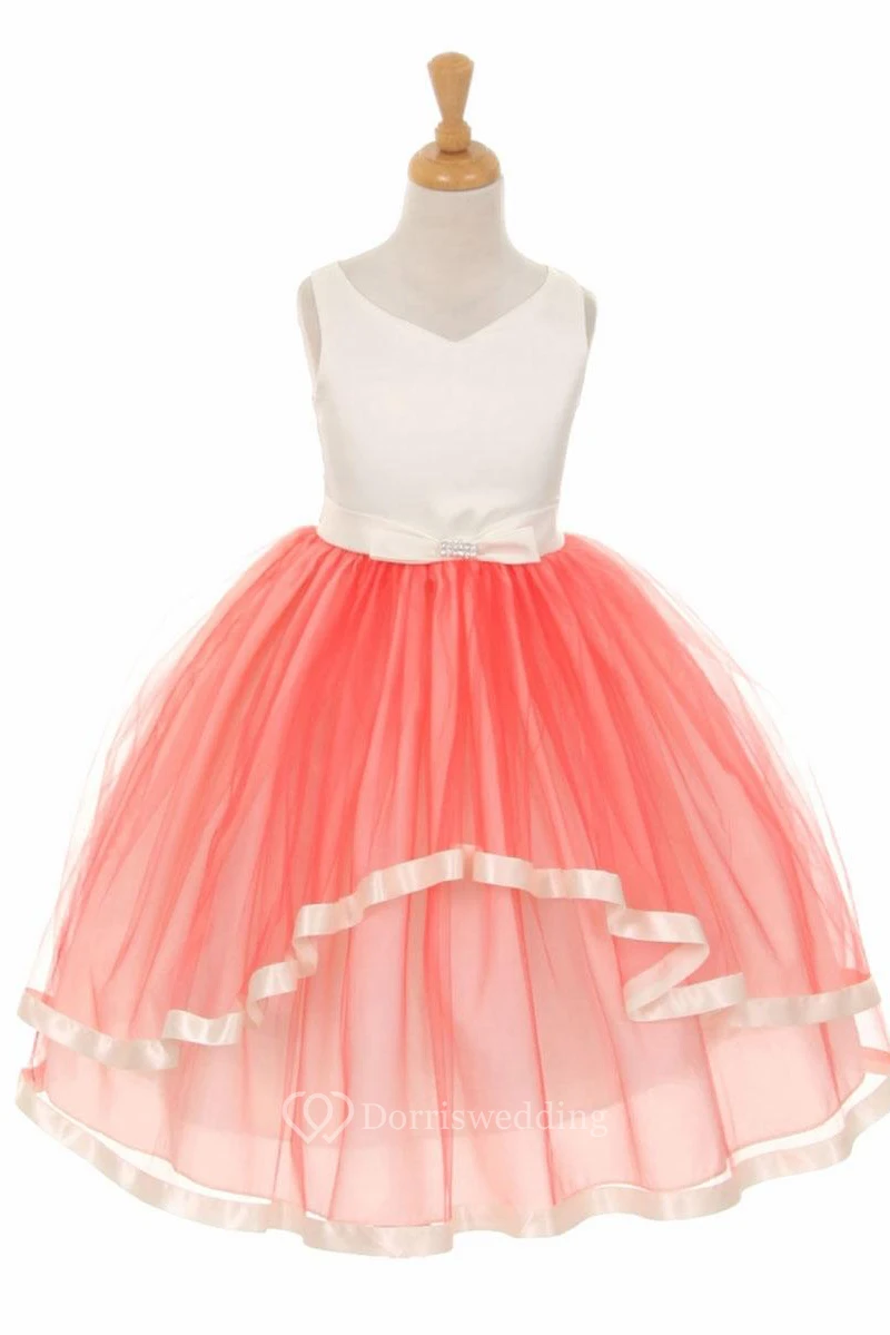 Tea-Length Peplum Bowed Tiered Tulle&Satin Flower Girl Dress With Sash