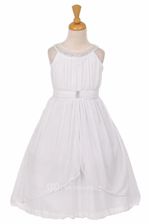 Tea-Length Peplum Pleated Tiered Chiffon&Tulle Flower Girl Dress With Sash
