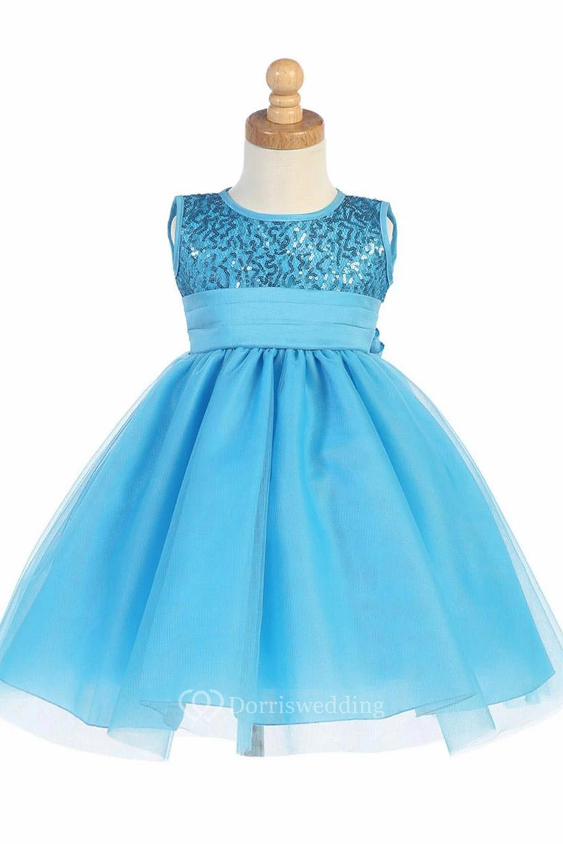 Tea-Length Pleated Empire Tiered Tulle&Sequins Flower Girl Dress With Sash
