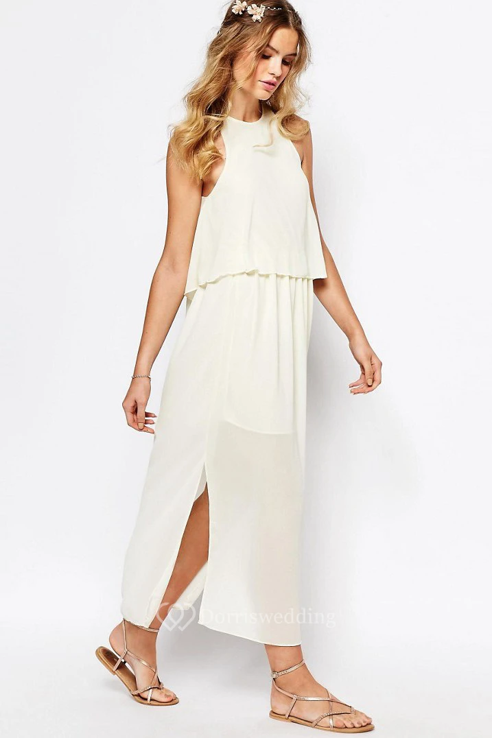 Tea-Length Pleated High Neck Sleeveless Chiffon Bridesmaid Dress With Split