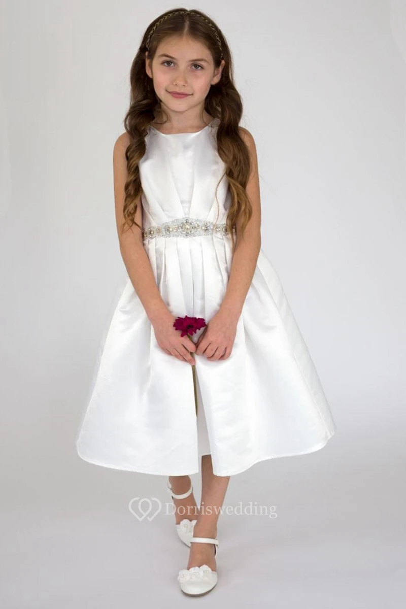 Tea-Length Pleated Sequins&Satin Flower Girl Dress With Tiers