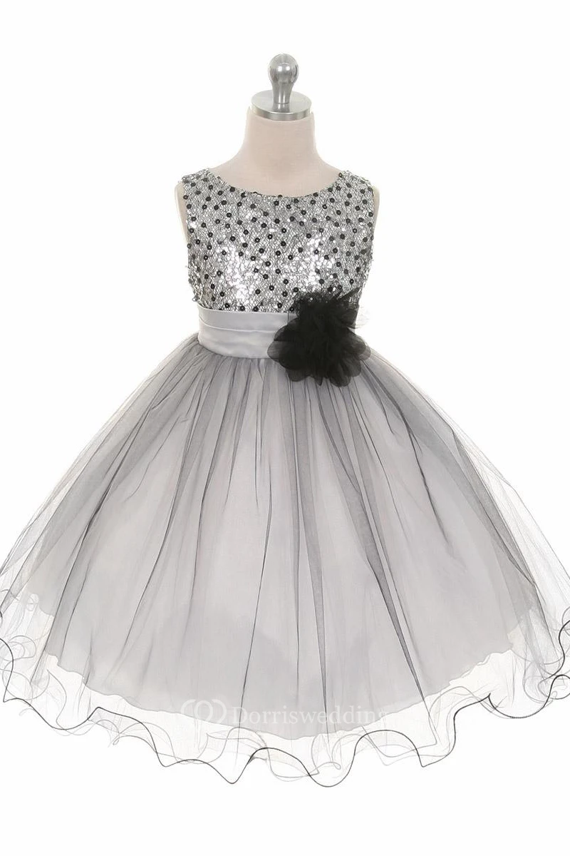 Tea-Length Pleated Tiered Sequins&Satin Flower Girl Dress