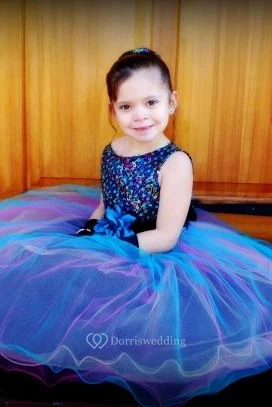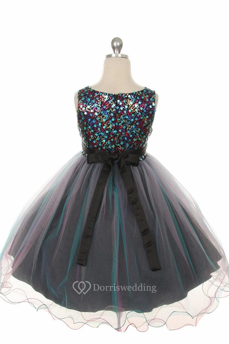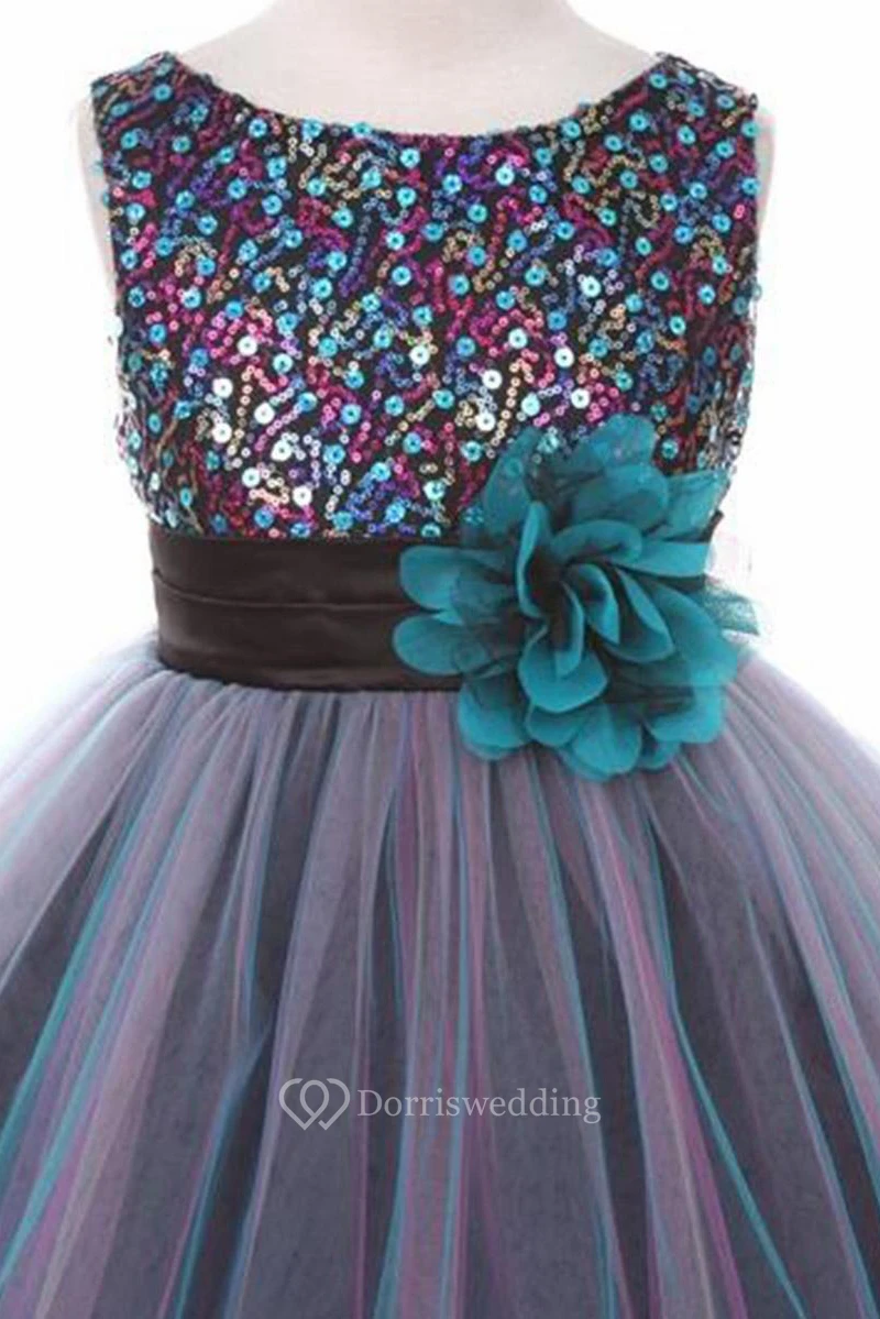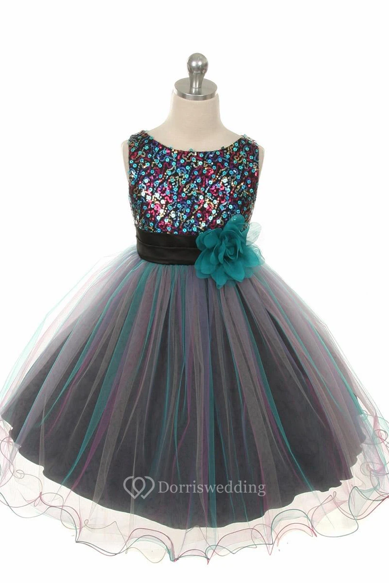 Tea-Length Pleated Tiered Sequins&Satin Flower Girl Dress
