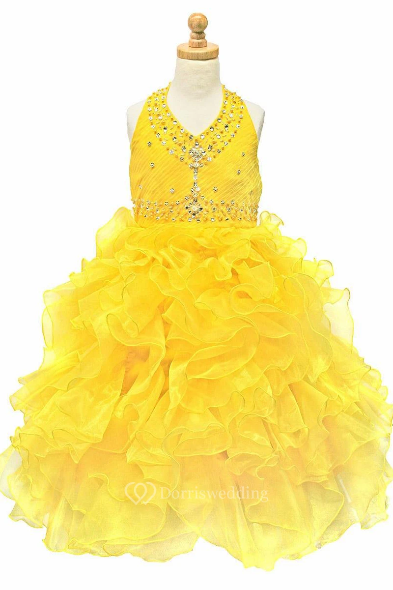 Tea-Length Ruffled Natural Beaded Tiered Sequins&Organza Flower Girl Dress With Ribbon