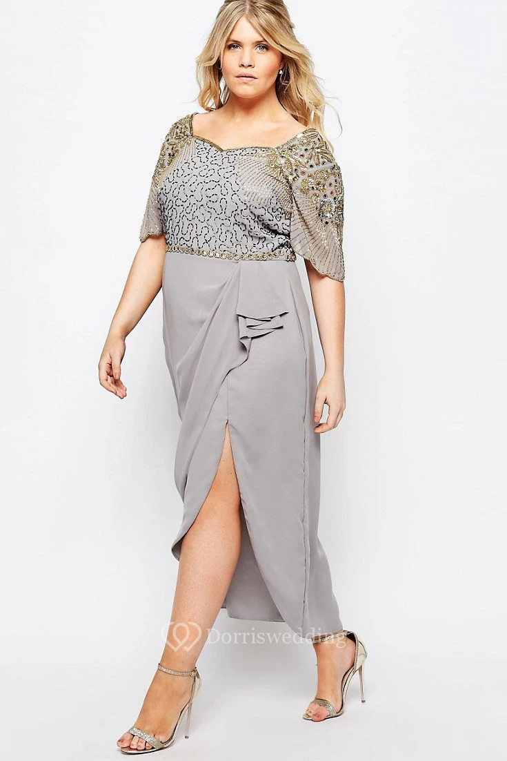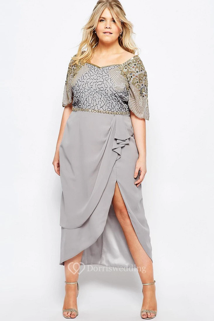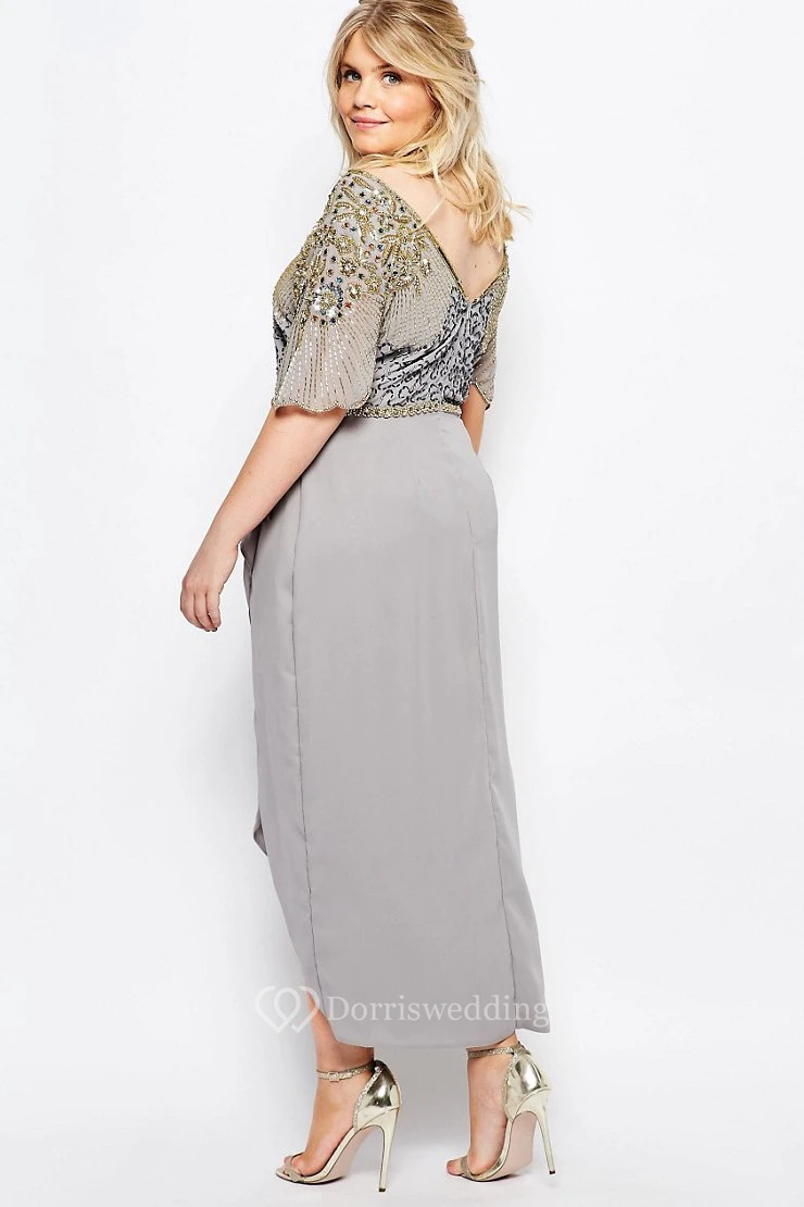 Tea-Length Scoop Neck Sequined Short Sleeve Chiffon Bridesmaid Dress