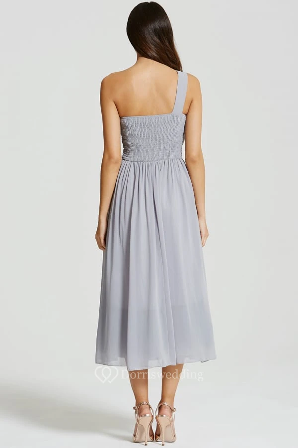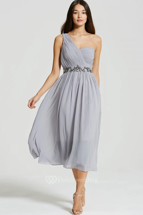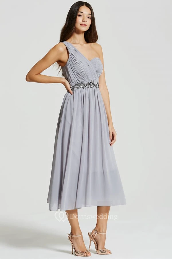 Tea-Length Sleeveless One-Shoulder Ruched Chiffon Bridesmaid Dress With Beading