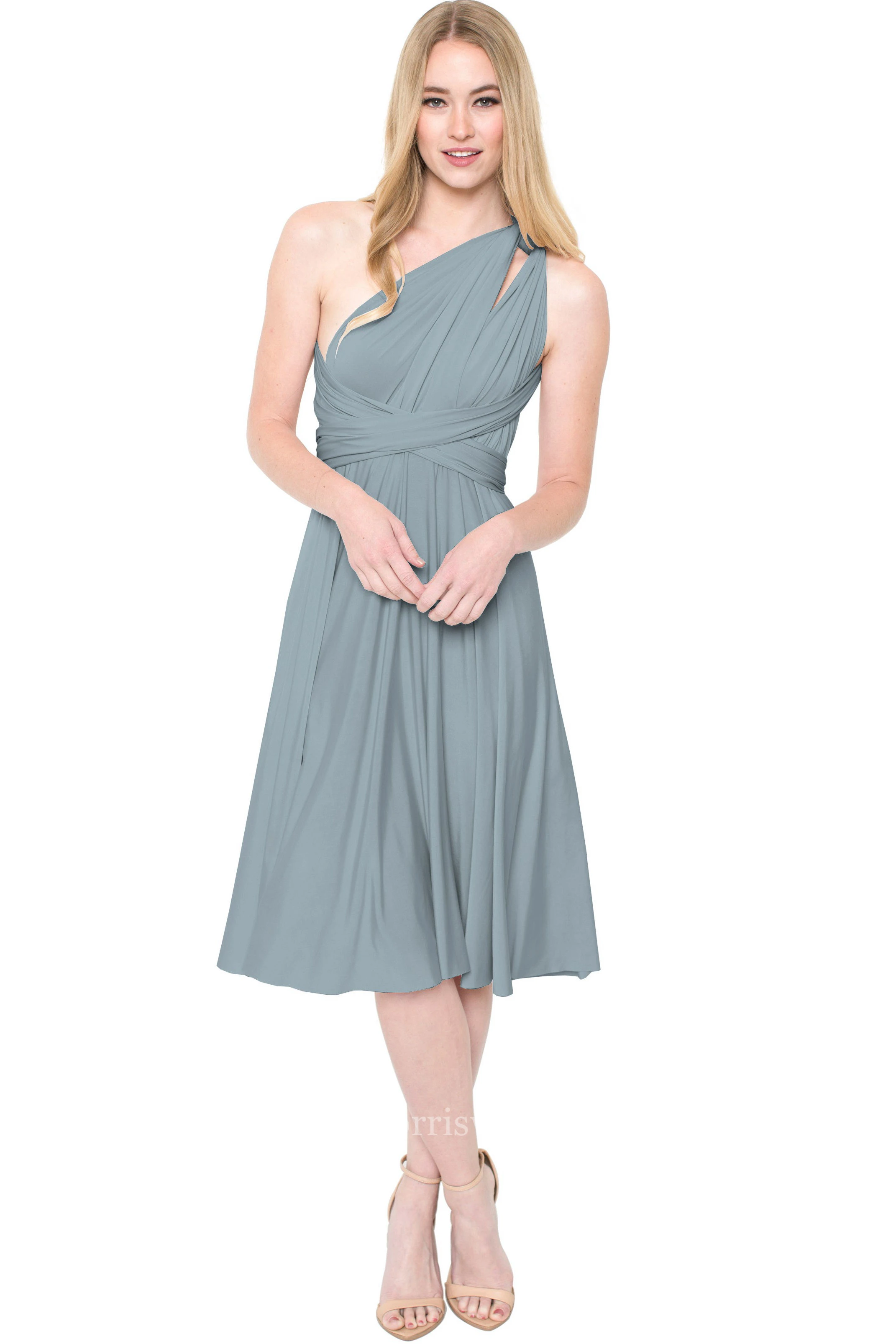 Tea-Length Sleeveless One-Shoulder Ruched Chiffon Muti-Color Convertible Bridesmaid Dress