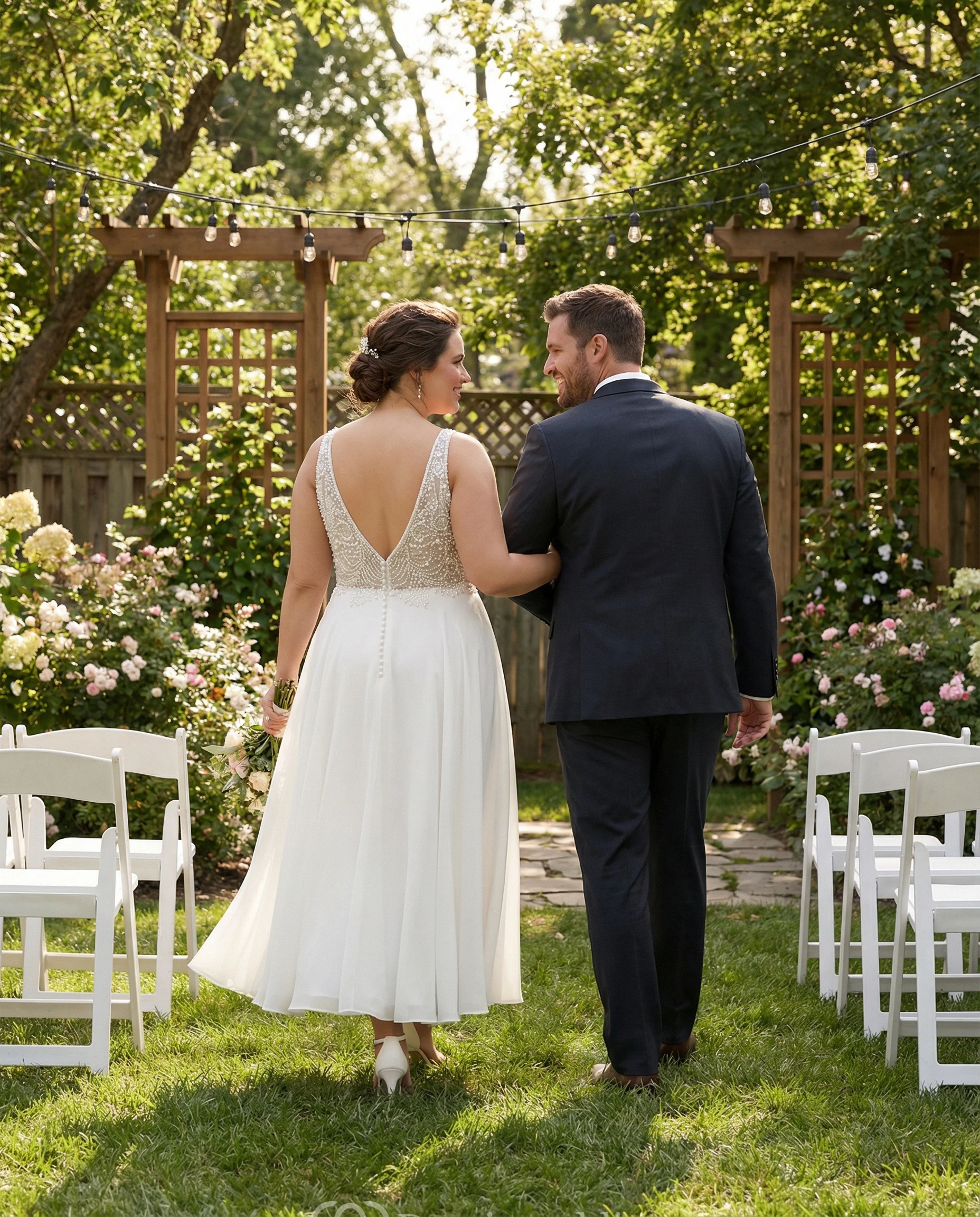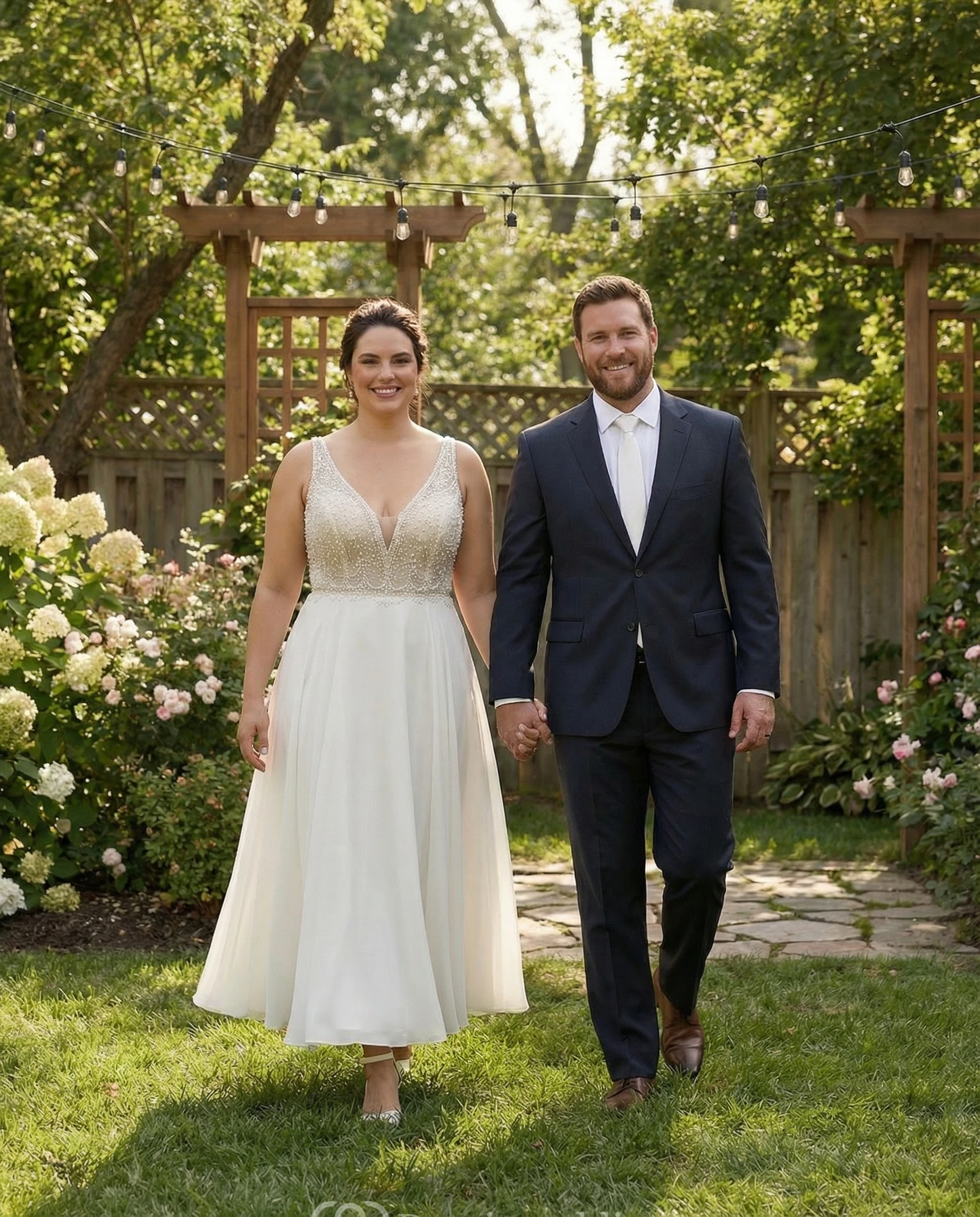 If you're looking for a fun and beautiful tea-length wedding dress, this is it. The combination of the beaded bodice and the flowy chiffon skirt is just lovely. I felt so happy and beautiful in this gown. The V-neck is very flattering and the fit is perfect. It’s a very special dress that I am so glad I chose for my big day. Highly recommend for a beach or garden wedding!